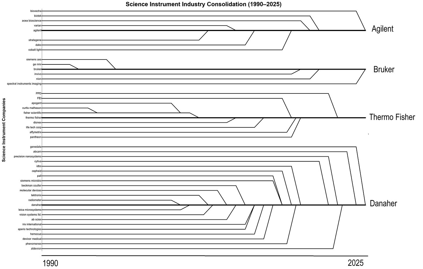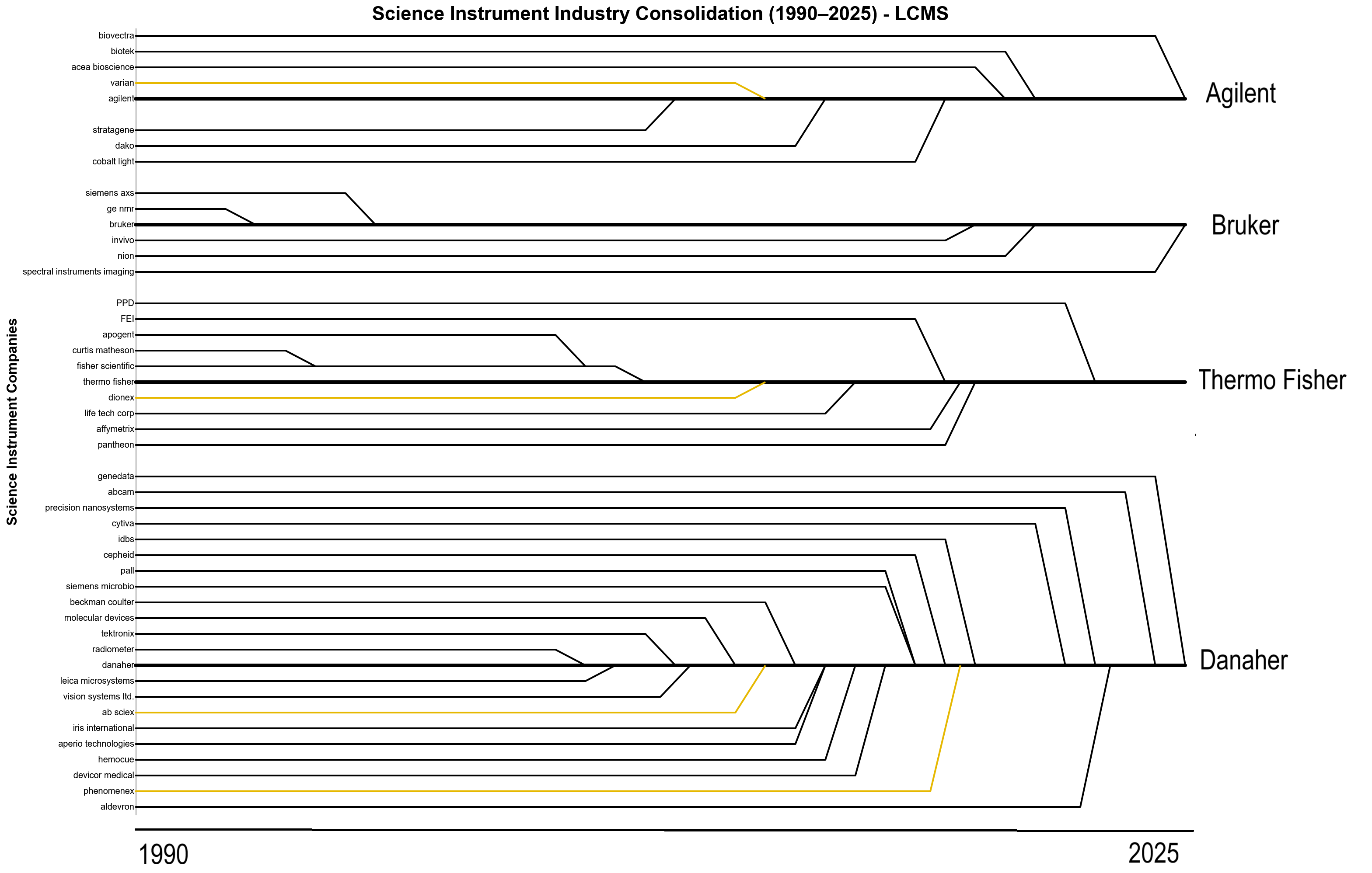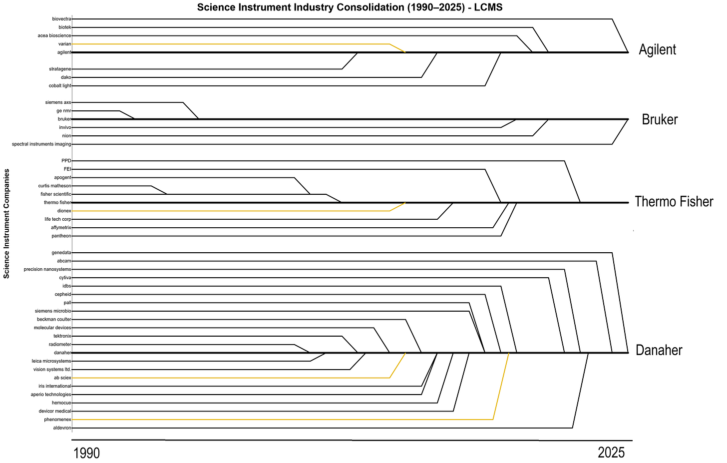 What surprised me as I learned more about the science instrument industry, was how often I ran into a familiar story: legacy primes who acquired and rolled up smaller companies, leading to expensive products with horrible software and high-cost recurring service contracts. Large science companies like Thermo Fisher are closer to science conglomerates, with bundles of subsidiaries acquired through acquisition.2 I was able to recreate the Last Supper M&A graph for the science instrument industry, looking at acquisitions from Agilent ($40B market cap), Bruker ($7B), Danaher ($160B) and Thermo Fisher ($200B). And the graph below is only a selected set of acquisitions.
